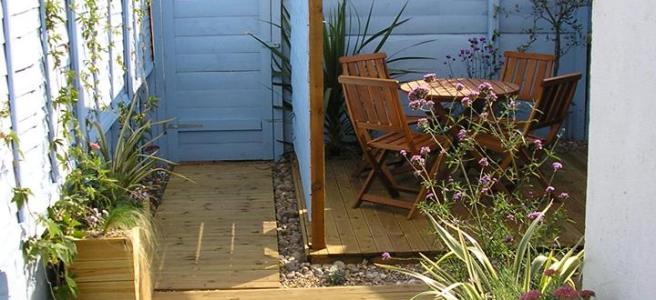 Before I got involved with this garden, there was a bicycle shed blocking this view, which actually was not a bad thing as all was to see was a patch of dying grass and a lot of concrete. The owners wanted somewhere easy to maintain with a seating area in the sun and some shade as the garden is south facing. This garden is in Worthing and they wanted to be reminded of the proximity of the sea which is why I used plants with a seaside feel, a sail, decking and gravel. (The bicycle shed is still there but was moved to a less prominent place).